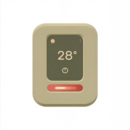 Modern beige wall mounted smart thermostat showing twenty eight degrees used for home interior heating control energy saving and comfort design