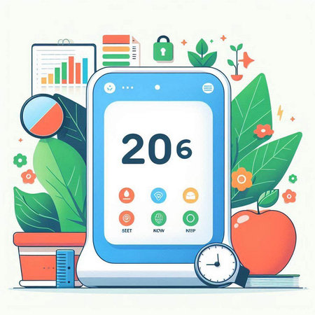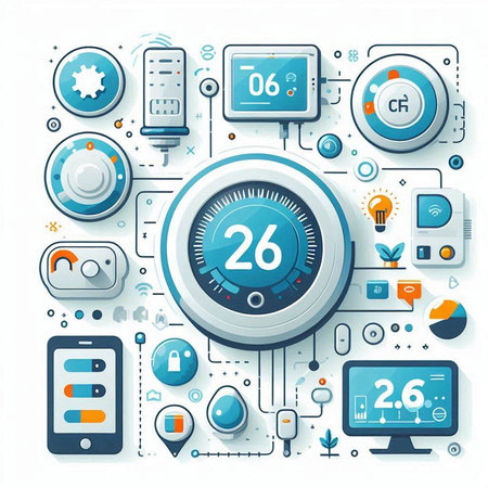 Digital composite of Digital thermostat with blue interface against bright room