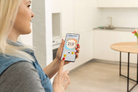 Close-up Of Woman Hand Setting Temperature Of Thermostat Using Smartphone Application At Home
