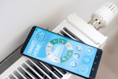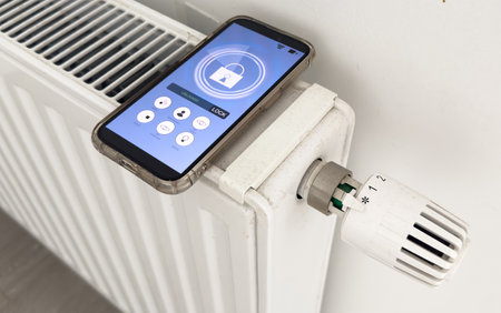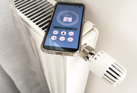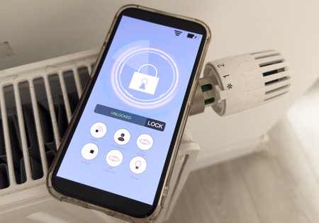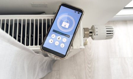 Smartphone with launched application for air temperature adjustment opposite the radiator. Health microclimate at home concept