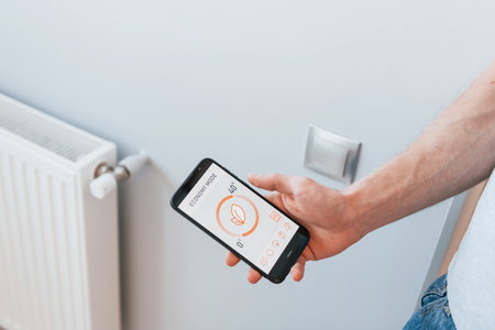 Man Controlling Central Heating Smart Meter Using App On Mobile Phone