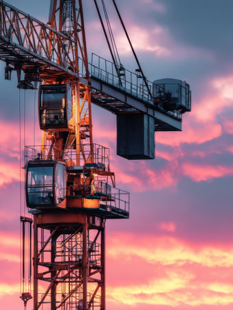 As the sun sets, casting a golden hue across the sky, construction workers and towering cranes are silhouetted against the evening light. The end of a day marks the progress of development. AI generation