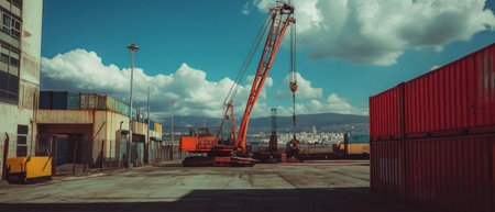 A dynamic scene of a shipping yard with a crane lifting a container, representing the complexity of logistics and transportation in an industrial environment.