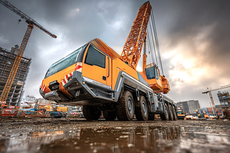 Powerful mobile crane dominates a bustling construction site, its imposing presence highlighted against a backdrop of rising buildings and other cranes working diligently under a cloudy sky