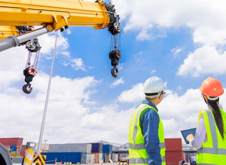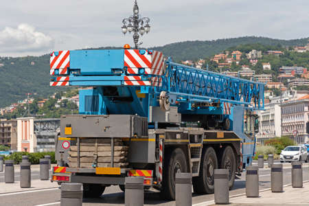 BANGKOK, THAILAND - July 5, 2019 : Mobile construction hydraulic crane with telescopic arm at construction site in Bangkok, Thailand