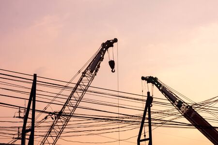 Silhouette construction crane against sunset sky. Crane use reel lift up equipment in construction site. Crane for rent concept. Crane dealership for construction business. Real estate industry.