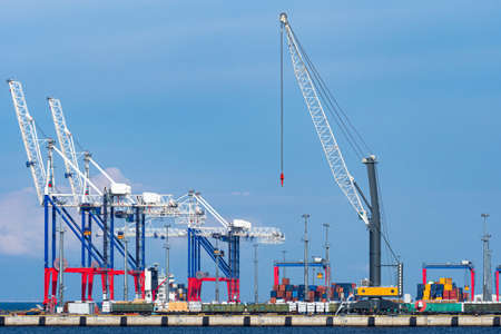 The infrastructure of the commercial port. Cranes for loading and unloading operations in the port. Loading of ships and railway cars. Transport terminal. Different types of cargo transportation.