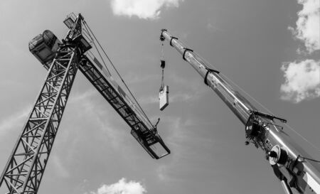 Tower crane assembly. Concrete counterweight installation. Artistic black and white skyline. Erecting of lifting device construction. High telescopic boom of a mobile hoist machine. Civil engineering.