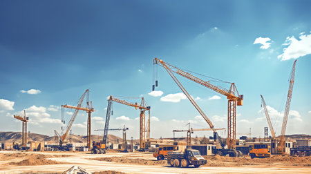 Majestic Tower Cranes Against a Bright Blue Sky in an Urban Construction Site Setting