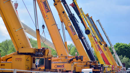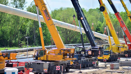 Warsaw, Poland. 17 May 2021. Several crane hook with straps is holding isolated pipe