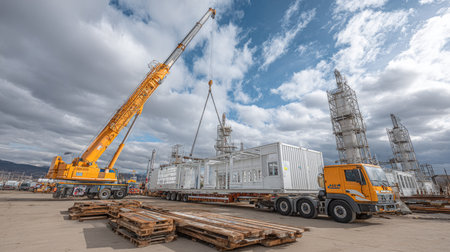 A construction site featuring a large crane and truck lifting modular buildings. Dramatic clouds fill the sky, highlighting industrial activity and logistics.