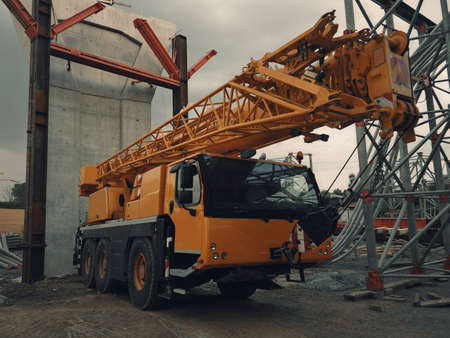Crane car on construction site, construction industry, yellow color, bridge construction, workplace