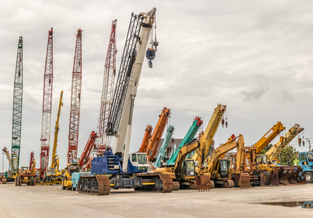 A dynamic construction site featuring tall cranes and industrious workers amidst heavy machinery under a moody sky. The scene captures modern industrial activity.