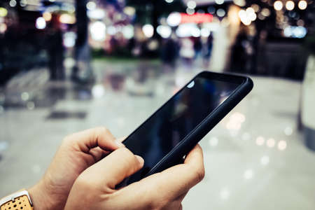 Woman hand using smartphone with shopping mall colorful beautiful bokeh background. Business, financial, trade stock maket and social network concept.