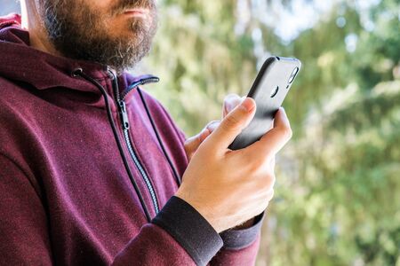 Man at park using smart phone, reading or typing a message on cellphone while, hands detail