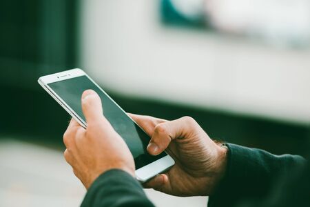 Closeup man hands using mobile smartphone.