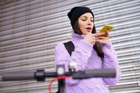 Woman in her twenties with electric scooter recording voice note with a smartphone outdoors.