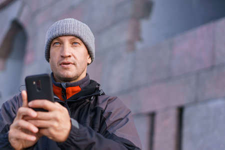Portrait of happy smiling caucasian man with smartphone on city street against brick wall background. In an autumn jacket and hat. Using your phone in different ways