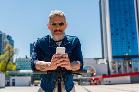 mature man in sunglasses using cellphone near electric scooter on urban street