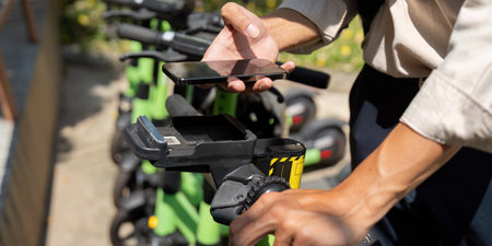 Woman's hands close up holding a phone near the modern city electric kick scooter, going to unlock it. Modern city transportation.