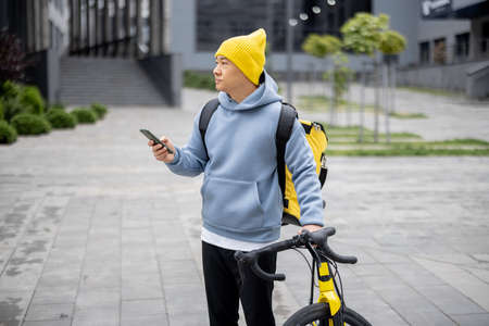Courier with bicycle searching clients place with GPS on smartphone in city. Concept of shipping and logistics during Coronavirus pandemic. Idea of profession and job. Asian man wearing warm clothes