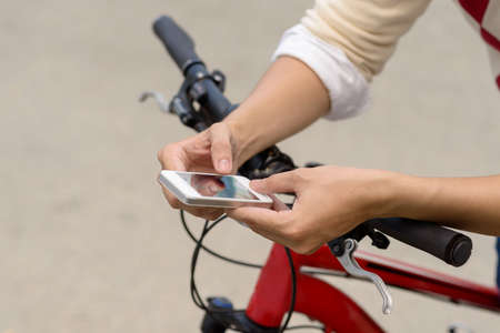 Close-up of unrecognizable man browsing smartphone while sitting on bike