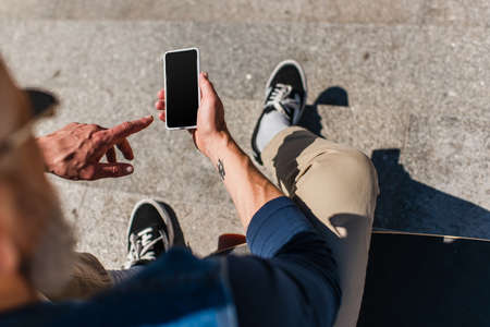 top view of tattooed mature man pointing at smartphone with blank screen near longboard