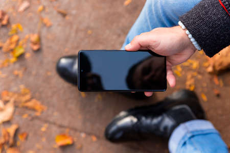 Man holding smartphone outdoors with yellow autumn leaves on the ground