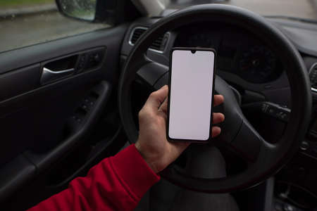 A blank screen mobile phone in the hand of a business man sitting in a sports car.