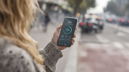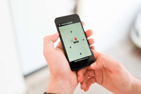Person holding a smartphone while waiting for his driver and looking at the navigation map on the ride share app