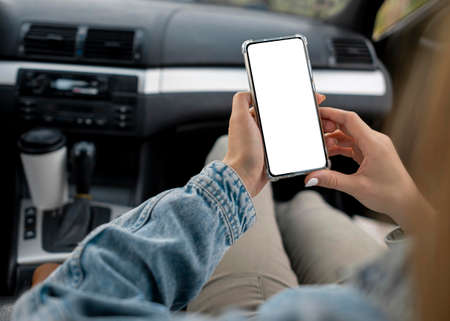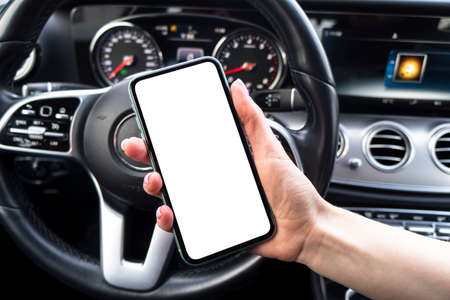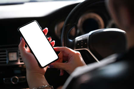 Female hand using smartphone in car. Smartphone in a car use for Navigate or GPS. Mobile phone with isolated white screen. Blank empty screen. copy space. Empty space for text.