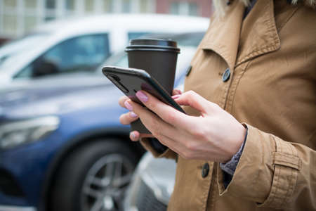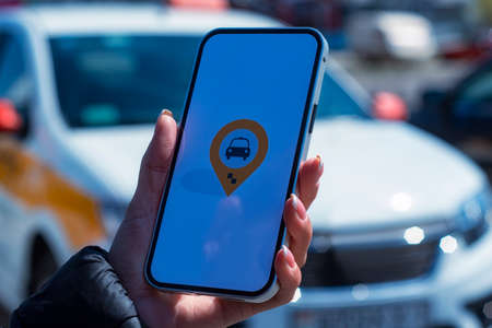 A girl passenger in the parking lot holds a smartphone with a mobile application and calls a taxi online