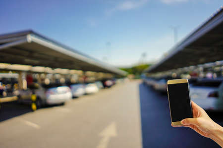 Hand holding mobile phone with outdoor parking lot building blurred background and bokeh light, Social network, internet