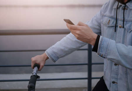 Young man wearing shirt leaning on electric scooter handlebar, holding mobile smartphone in his hands, closeup detail