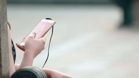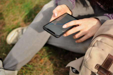 A smartphone is in the hands of a woman. Communication using a smartphone.