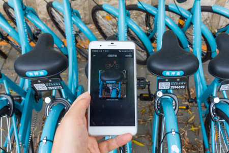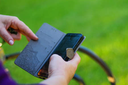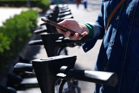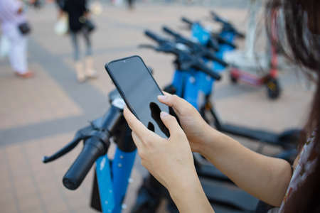 Woman's hands close up holding a phone near the modern city electric kick scooter, going to unlock it. Modern city transportation.