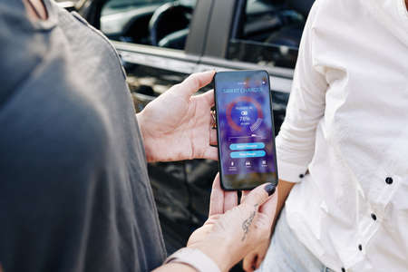 Hands with smartphone on a background of rental car at the charging station for electric vehicles. Car sharing.