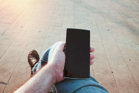 Male hand holding a mobile phone with black screen mockup. Template for web design or app presentation. Gadget closeup. Space for text. Concept of digitalization, business, remote work and freelance