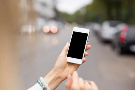 Call a taxi using a mobile app, a young woman standing by the road and waiting for a car. Smartphone in hand close up
