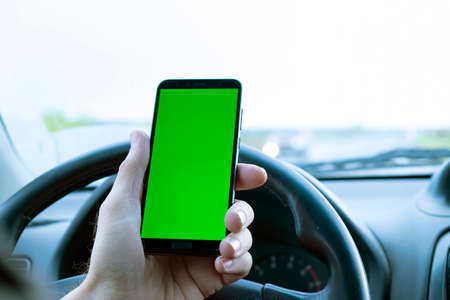 Mobile phone with a green screen in a man's hand inside a car. Blank screen for content integration, mock up