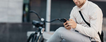Close-up of unrecognizable man browsing smartphone while sitting on bike