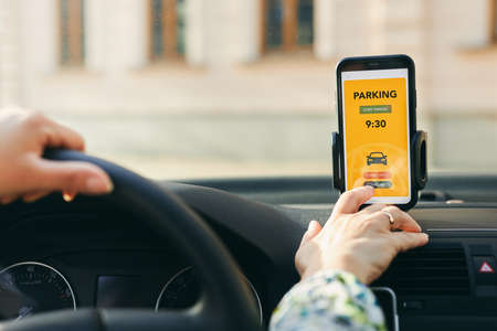 Woman using mobile parking app on smartphone. Driver using smartphone to pay for parking. Car park application on mobile phone. Convienience paying for parking using fast payment online. Mobile park service