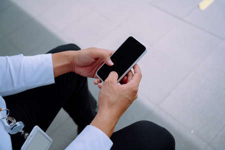 close up businesswoman hand holding smartphone to checking job and reading mail inside car before go to meeting at company for business and transport ion concept