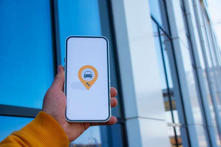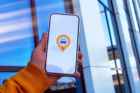 Man passenger in the parking lot holds a smartphone with a mobile application and calls a taxi online