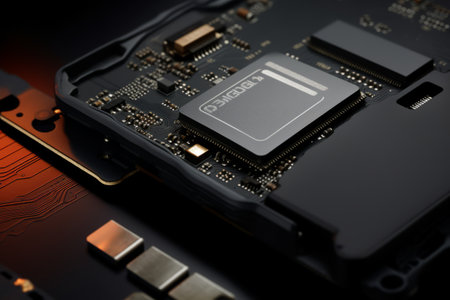 This close-up image showcases an electronic circuit board component featuring various chips and pins, illuminated by soft light. Perfect for technology themes.