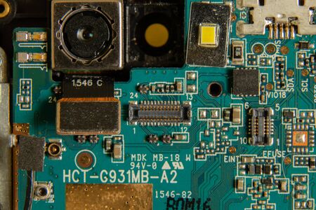 Tablet repair. Close-up disassembled mobile phone parts. Colorful blue background.
