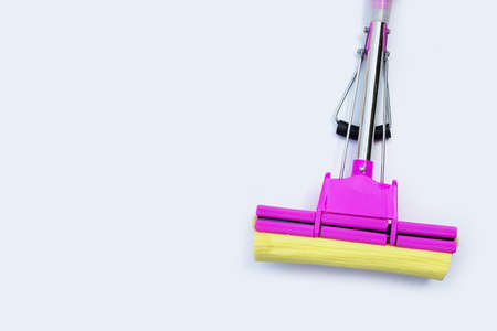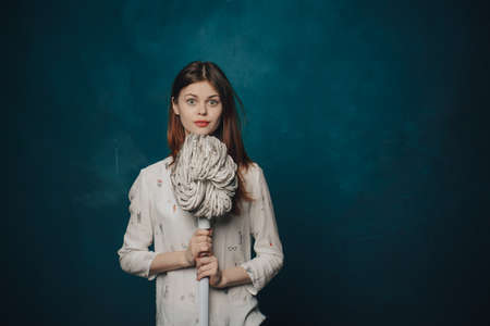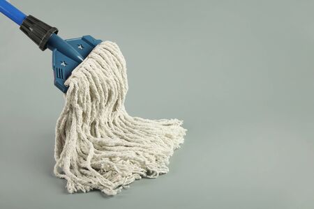 floor mop after cleaning on the wall of old public toilet in evening light , background with space for text or image