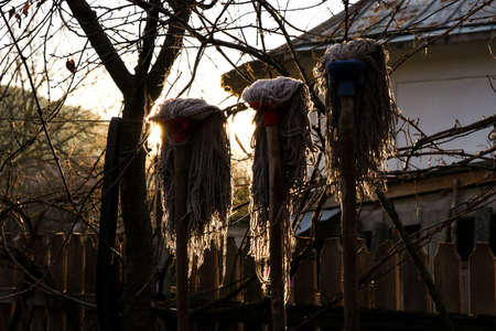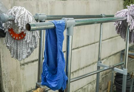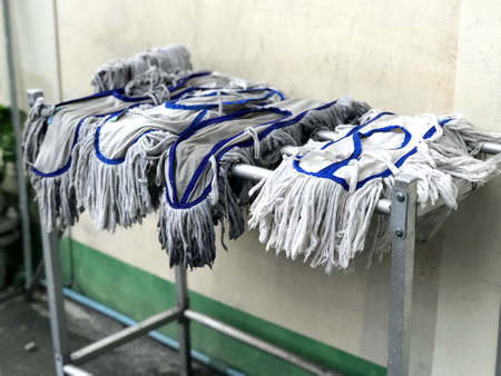 Many kinds of mops with handmade mop made of pieces of cloth and wood stick rest on the wall