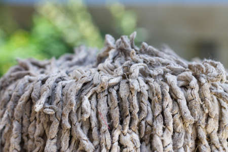 A normal view from below of an armchair of a rope mop being wiped across the floor of a house. Cleaning work.