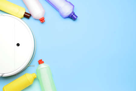Robot vacuum cleaner and bottles of detergent on color background, closeup